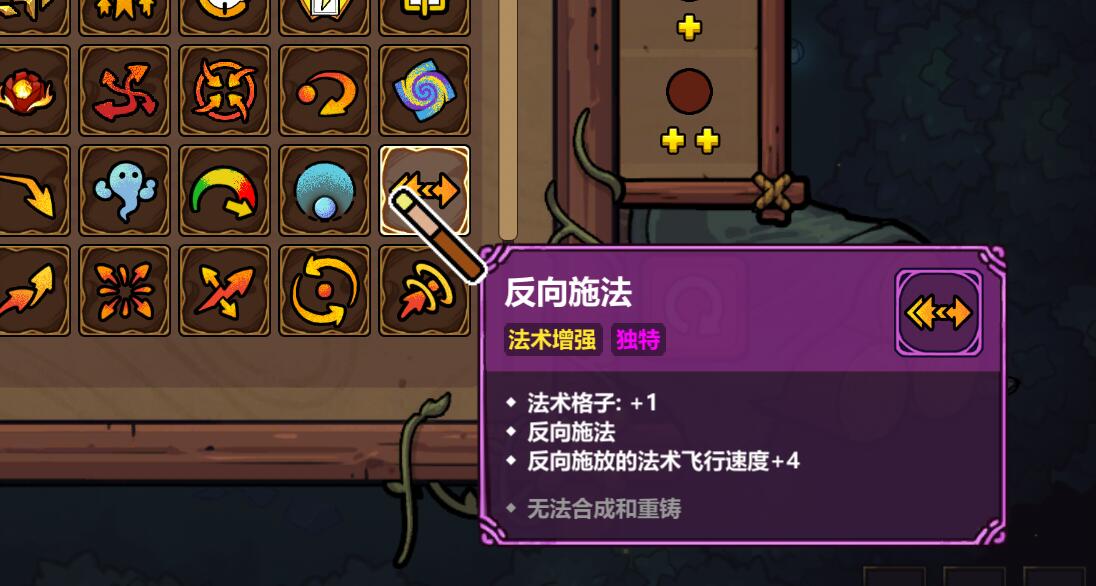 反向施法(飞行速度+4,施法方向反转):正面加成有限,负面操作影响明显。除非构建“龟缩炮台”类无需移动的固定输出体系,否则极易因操控反向导致走位失误。盲目装备此法术会严重干扰输出节奏,建议仅在明确流派需求时选用。