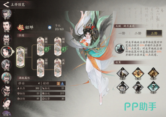 貂蝉既是一个美女角色,又是一个超强的辅助武将,仅仅是在初始时的天赋就已经非常高了,施展法术之后可以保留15点的战意,并且能为整个队伍的综合输出带来增益效果。