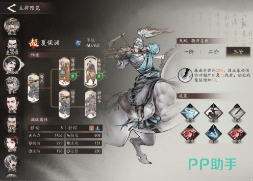 夏侯渊是一个弩兵,手中的弩箭将会使它与敌人对战的强力武器,它在输出方面简直是让人大吃一惊。优秀的机动性和输出能力,直接就可以对敌人造成远距离的猛烈攻击,移动增伤效果也更是显著。此人物比较善于使用哗变之策,大范围内的敌人发生叛乱之后,将会造成敌方互相攻击的局面,此时一定可以减轻我方的战斗压力。