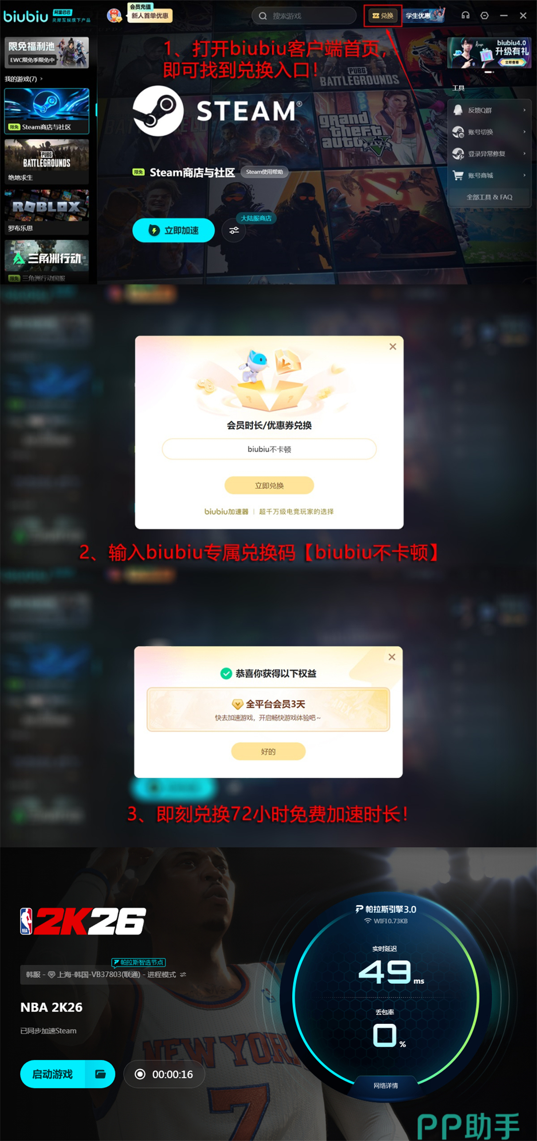 无论大家想要玩哪一种模式,小编都非常推荐使用biubiu加速器来优化游戏。这款biubiu加速器软件在进行技术重磅升级之后,使用了帕拉斯引擎3.0,效果出色,特意邀请到了冠军选手Aixleft加入进来参与,实现加速性能提升。玩家还可以享受到非常丰厚的福利,例如新注册的biubiu账号不用着急充值,直接就能免费加速24小时。还可以通过输入兑换码【biubiu不卡顿】,得到三天加速时间,每个号都可以用一次。