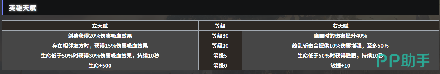 技能方面,黑骑士归属于暗影系职业,普攻“剑幕”以低能耗实现高频输出,配合3x28%的敏捷加成与基础攻击力,在不消耗能量的前提下持续压制敌人。能量技“缭乱斩击”则是主要爆发手段,融合270%敏捷与330%攻击力的复合伤害,并附带溅射效果,能对多个目标造成毁灭性打击。两个被动技能进一步强化了他的突袭能力:开场即可触发闪现与隐匿,使其能在首轮集火中成功规避致命伤害,极大提升了生存概率。
