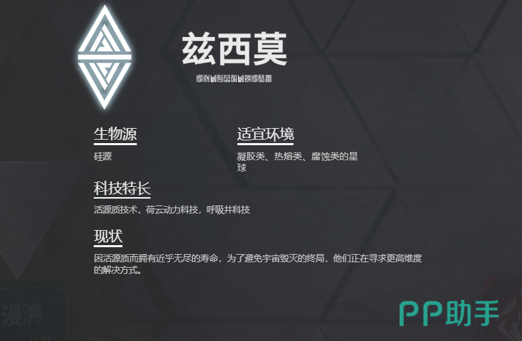 兹西莫族则属于硅基生命体,偏好凝胶、热熔与腐蚀性星球作为栖息地。他们具备近乎永恒的寿命,并专注于活源质应用、呼吸井构建以及荷云动力系统的研发。当前,该种族正致力于寻找阻止宇宙崩塌的关键方案,肩负着维系宇宙平衡的重大使命。