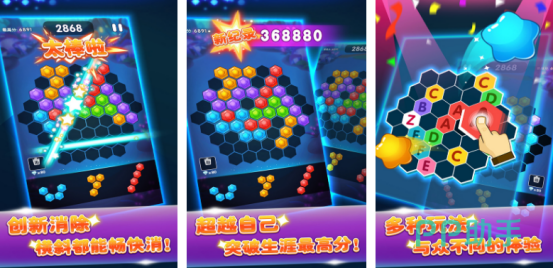 作为曾经风靡一时的经典IP,《泡泡龙传奇》回归后依然具备强大吸引力。游戏包含超过480个精心设计的关卡,并新增计分系统增强竞技性。上方不断掉落彩色球体,玩家需精准瞄准,将同色泡泡连接消除。一次性清除的数量越多,得分越高。采用真实物理引擎模拟弹道轨迹,操作反馈灵敏,可玩性和挑战性兼具。