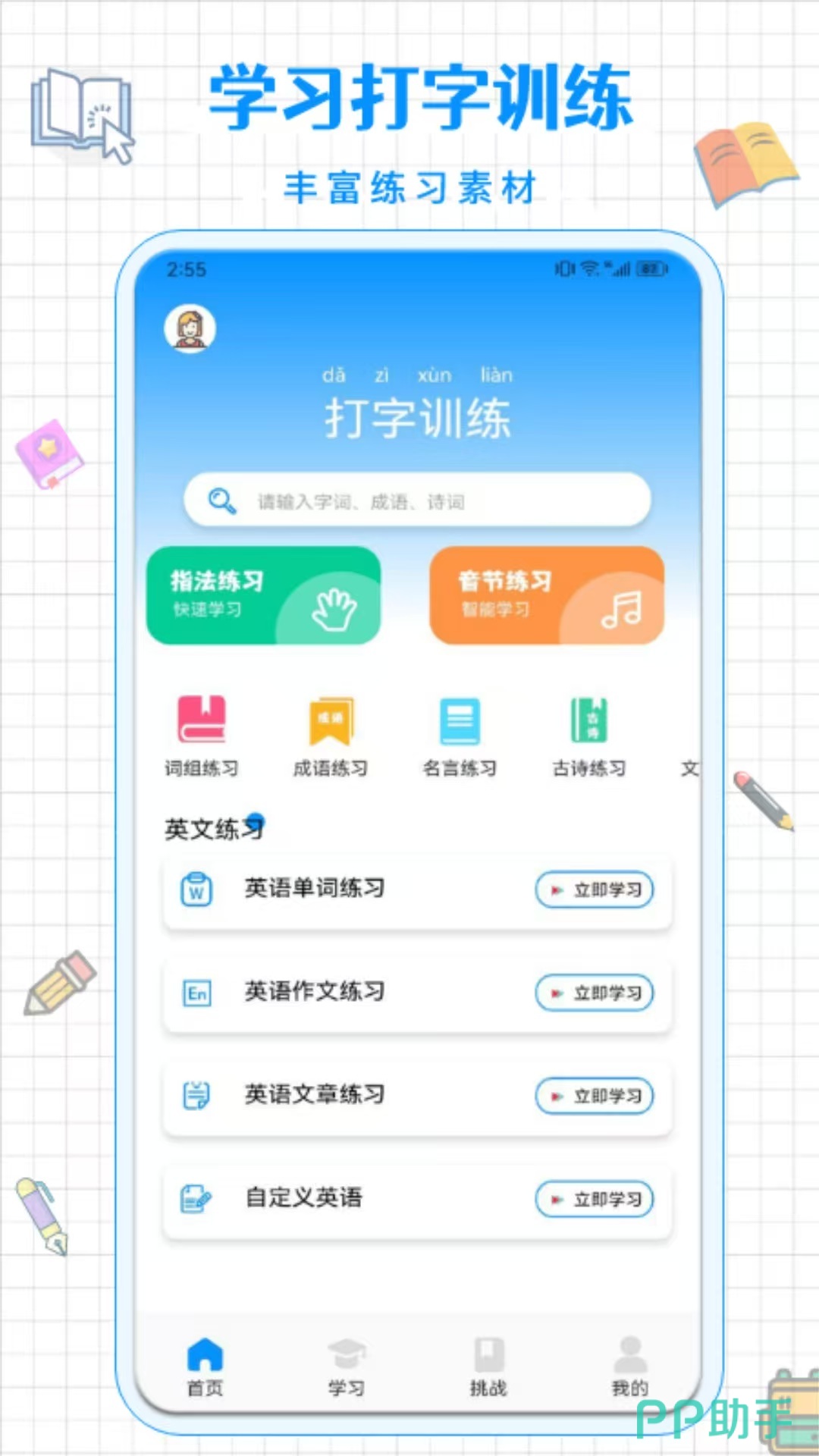 这款应用界面简洁,操作逻辑清晰,即使是初次接触打字训练的用户也能迅速上手。软件从拼音的基础构成入手,系统性地安排了声母、韵母及整体认读音节的专项练习,帮助用户逐步建立输入认知。通过随机生成的拼音组合练习题,强化用户的反应速度与准确性。此外,内置大量由易到难的拼音文章训练内容,在提升打字效率的同时,还能扩展汉字识别量,实现双重学习效果。
