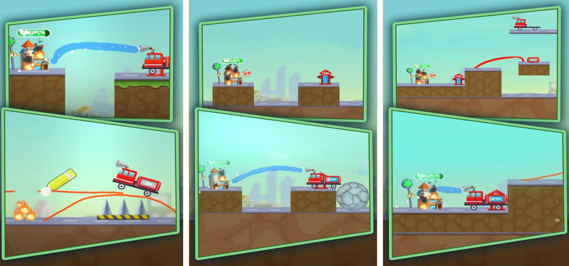 《物理消防车》的火灾场景的建模虽然没有过多华丽的装饰,但每一次喷射水流的轨迹和每一处建筑物的倒塌都呈现出符合物理规律的效果。同时,玩家们在游戏中可以自由操控界面中的各类消防车与驾驶员,且车辆根据型号不同,速度、承载能力和喷水距离都有差异,这让玩家在不同任务中需要合理选择出场车辆。此外,该作纪委考验玩家们的资源管理与操作细节能力,尤其在水量有限的条件下,玩家必须准确瞄准火源,避免无效浪费,而火灾的蔓延速度也要求玩家快速判断优先救援区域。