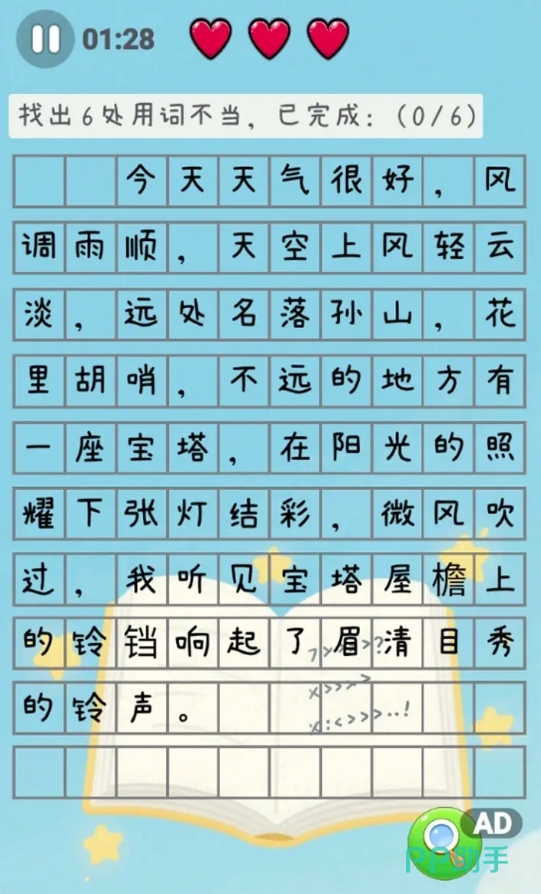 在游戏中扮演语文纠错助手,阅读由系统提供的学生作文,并找出其中存在的错别字。每篇文章包含若干典型易错汉字,这些错误具有普遍代表性,常见于日常书写中。游戏会提前告知待查找的错字数量,便于玩家有针对性地排查。通过反复练习,有助于强化正确字形记忆,提高语言表达准确性。