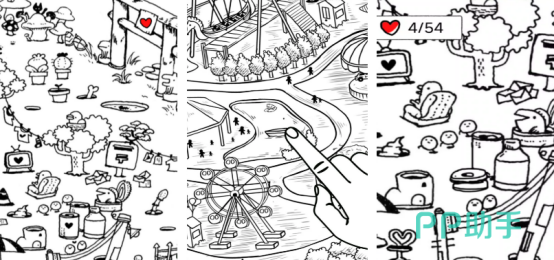 采用极简黑白手绘风格,游戏呈现出富有艺术感的视觉效果。场景中包含摩天轮、参天大树等多种元素,每个画面都暗藏玄机。玩家需在海量关卡中寻找指定物品,达成目标后方可解锁更高难度的挑战。玩法轻松却不失趣味,非常适合用于放松思绪、锻炼专注力。