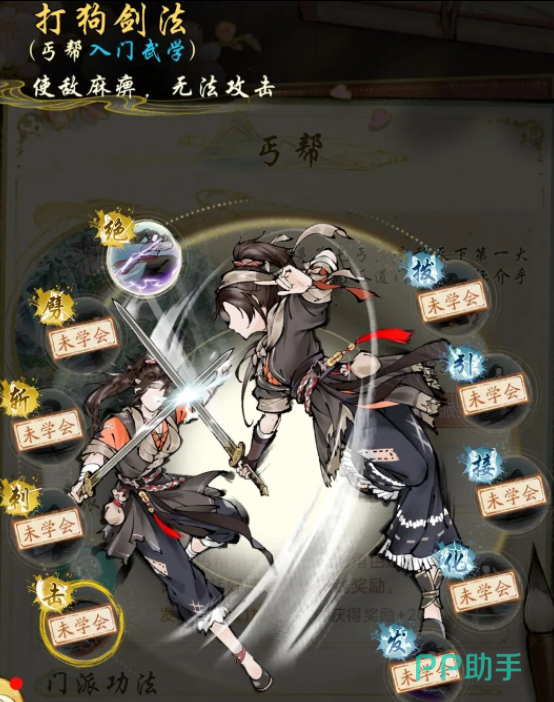 除了独特的乞讨机制外,丐帮还拥有丰富的武学系统。打狗剑法是门派基础剑术,招式灵活多变,适合应对各种战斗场景。八仙醉剑则别具一格,使用者可在酒意加持下激发更强战力,实现爆发式输出。另一门高深武技为降龙十八剑,主打控制效果,能持续释放技能使对手陷入眩晕状态,难以反击。不同功法各具优势,玩家可根据战斗节奏自由搭配使用。