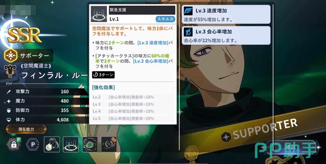 其主动技能“空间魔力弹”可对单个目标造成80%魔攻伤害,每提升20点速度额外增加4%伤害,并为自身回复1点SP,兼顾输出与资源续航。辅助技能“紧急支援”可在短时间内为队友提供55%速度加成和22%会心率提升,持续3秒,强化后触发概率更高,极大优化输出节奏。协力技能则为核心buff技能,初始提供20%会心伤害加成,每次升级叠加5%,最高可达40%,是构建爆发阵容的关键支撑。