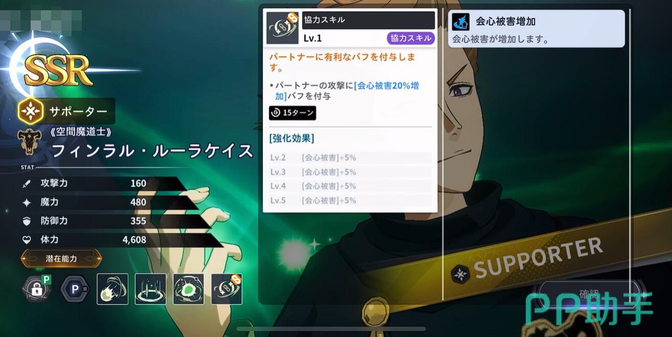 从基础属性来看,芬拉尔拥有160攻击力、480魔力、355防御力以及4608体力,符合高魔力、低攻击的典型支援型角色定位。作为金色黎明团的重要成员,其核心价值不在于输出,而是通过空间魔法为队伍提供关键增益。在SSR角色中,他的魔力值处于上游水平,能有效提升技能释放效率与辅助强度。