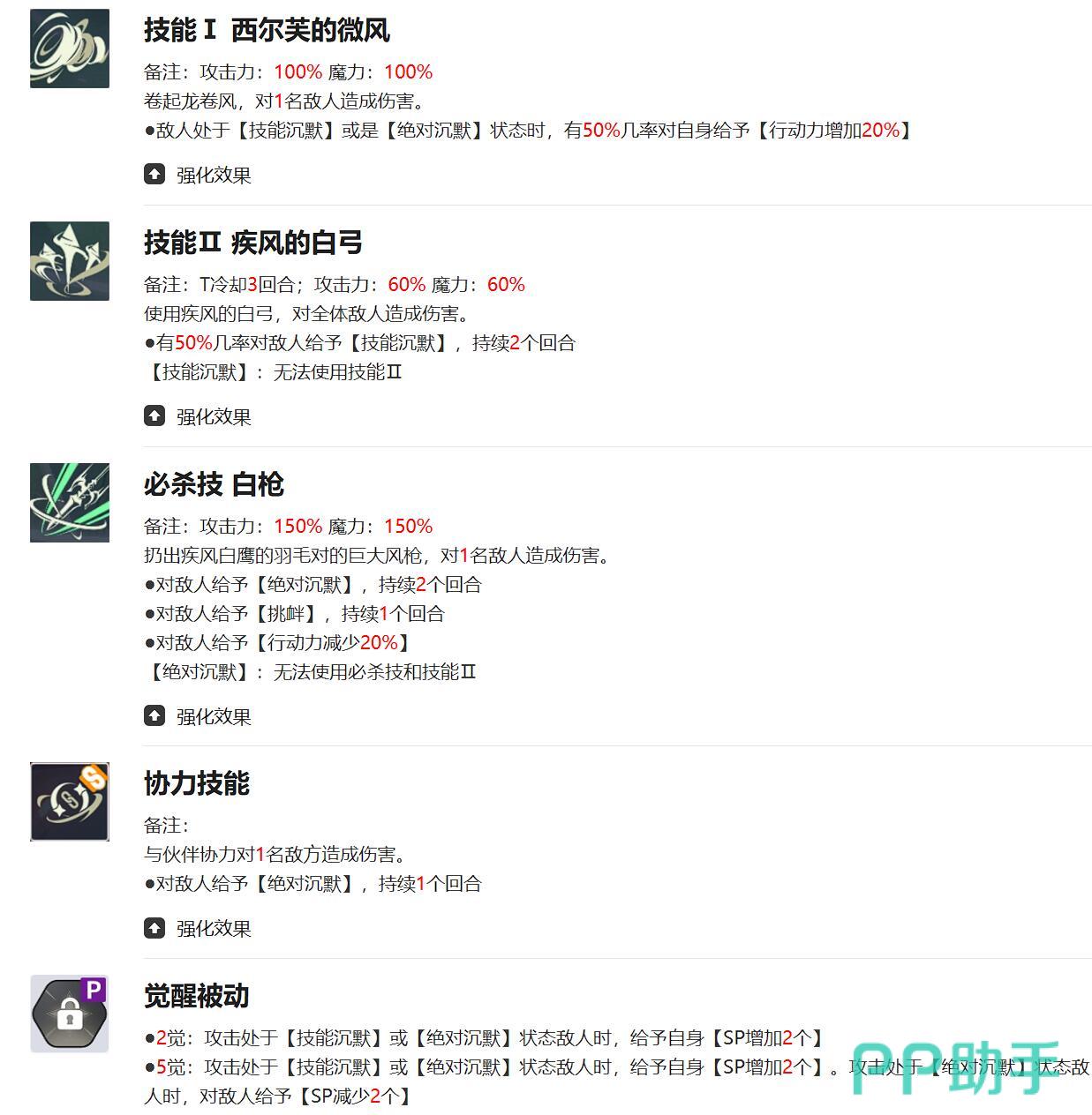 风刃是一个起手技,在击倒或暴击时会触发全体追击,完美适配多段攻击型队友。疾风之白弓不仅仅是有着非常宝贵的群体破甲,而且60%的触发概率在实战中体验下来是相当可靠的了,必杀技白枪则是真正的控场标志性技能,150%的单体伤害配合绝对沉默+挑衅的双重debuff,能精准封锁敌方关键角色的主动技能和必杀。醒被动进一步强化控制,攻击沉默目标时SP回复保证技能的后期combo,5觉后追加的SP削减效果更是让对手直接放不出技能→丢sp→放不出技能的循环,这套技能设计让该角色既能担任副C补伤害,又能作为战术控场大C。