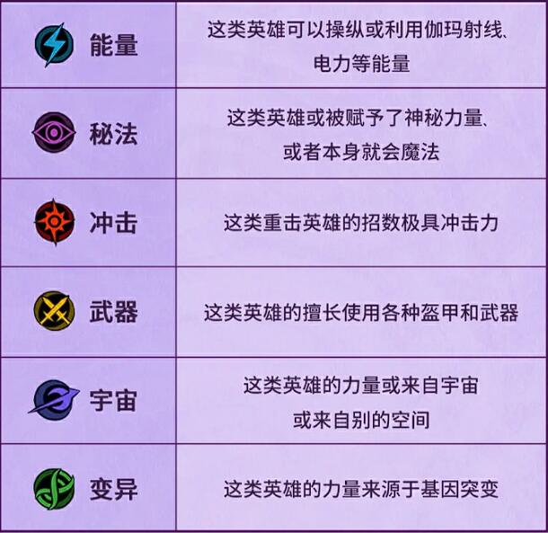 有的玩家会误认为英雄属性为他的定位,其实这个适合职业相辅相成的。分为能量、秘法、冲击、武器、宇宙、变异六种,直接影响技能效果。能量属性增强技能伤害,秘法属性提升控制时长,冲击属性增加暴率,武器属性强化普攻,宇宙属性降低技能消耗,变异属性概率触发额外效果。推荐搭配:射手+武器、能量属性,战士+冲击、变异属性,操控者+秘法、宇宙属性,防御者随便。