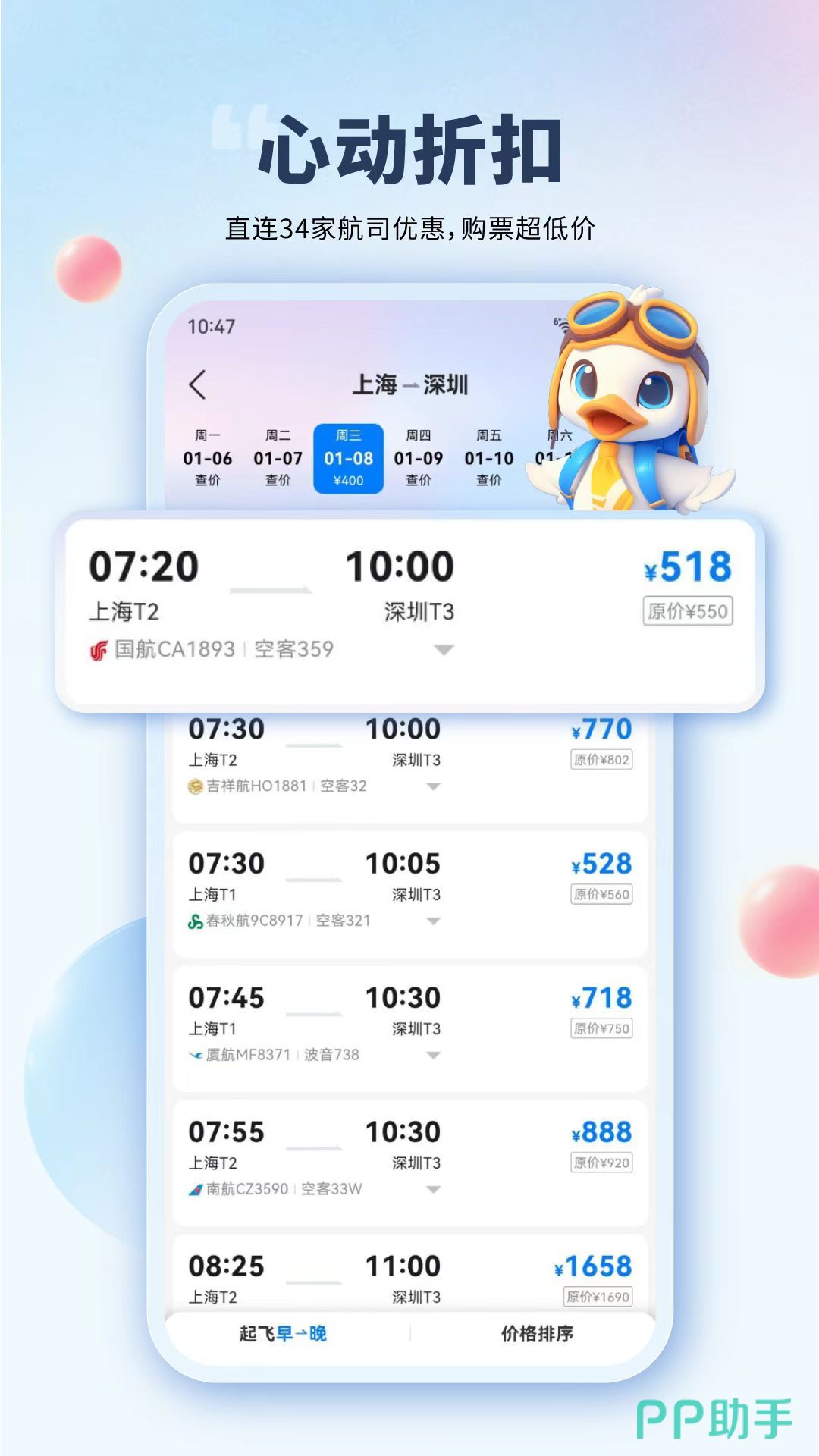 这款应用覆盖全球范围内的航班资源,无论你是计划国内短途出行,还是国际长途旅行,都能在这里查到合适的航班信息。界面设计简洁明了,操作流程顺畅,只需输入出发地、目的地和出行日期,系统便会快速展示多个可选航班。内置智能比价功能,自动对比不同航空公司的票价差异,帮你锁定低价票源。同时提供完善的售后服务体系,一旦遇到改签、退票等问题,客服会及时协助处理,保障出行无忧。