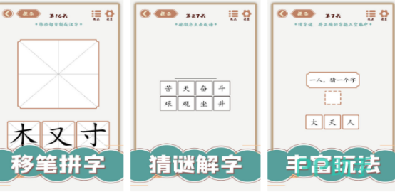 专注于汉字多样性展示,包含多种玩法模式:猜字谜、写生字、添一笔变新字、一笔拼合等。通过系统化训练,帮助玩家掌握汉字部件构成原理,特别适合正在识字阶段的小朋友边玩边学,轻松体验汉字演变的乐趣。