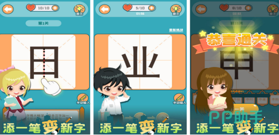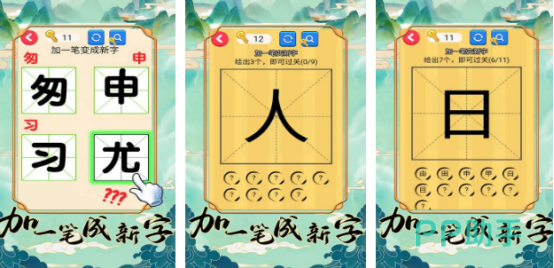 界面简洁清晰,字体设计工整美观,玩法围绕“添加一笔生成新字”展开。例如“人”字,在撇和捺交汇处加一横即可变为“大”。每一关提供的基础字各不相同,玩家需结合已有知识联想相近汉字,并准确完成笔画补充才能顺利通关,极具学习价值。