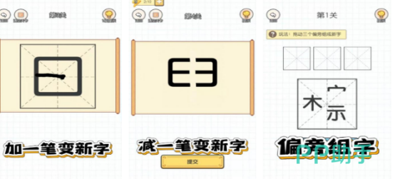 拥有大量关卡设计,除基础的“加一笔变字”外,还设有选项判断模式。每关给出一个原始汉字,下方列出多个可能结果,玩家需选出正确答案完成挑战。另有偏旁组合功能,如“示”上加“宀”可组成“宗”,帮助理解构字规律,深入体会汉字构造的艺术性。