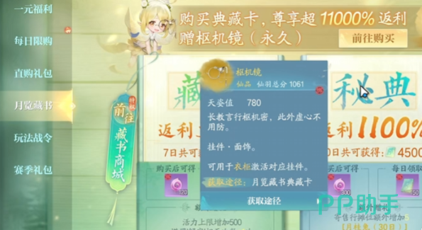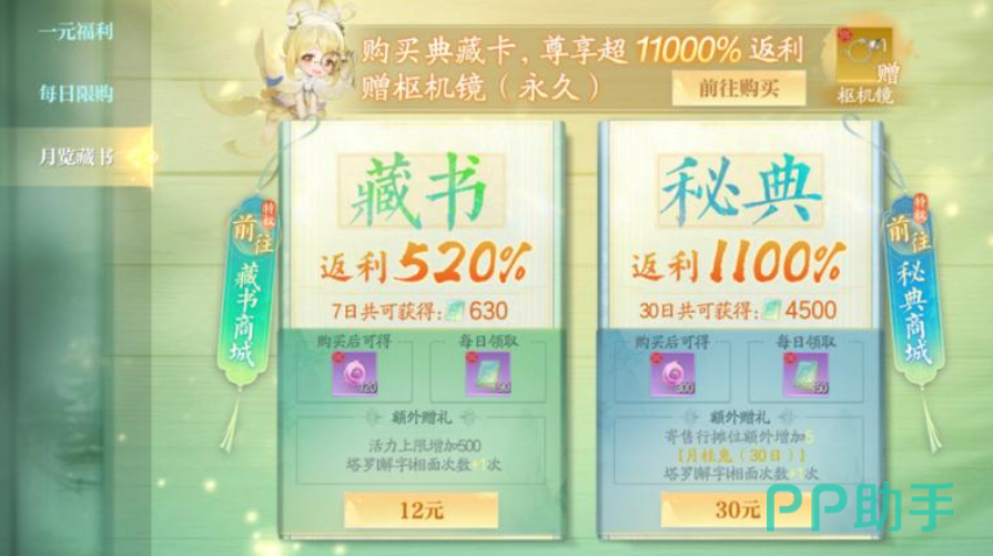 在游戏中,月卡是使用频率较高的氪金项目之一,因其能持续提供多种实用奖励。进入商城后,玩家可在“月览藏书”板块找到两种类型的月卡选项。其中一种为典藏月卡,售价为12元,有效期为7天。购买后每日可领取返利奖励,同时角色的活力上限会得到提升,并增加塔罗解字的使用次数。此外,每天还可获得一定数量的经验丹和银币,这些资源可用于角色成长或道具兑换,适合初次尝试付费功能的用户选择。