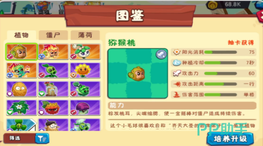 作为金卡植物中的顶尖输出代表,猕猴桃凭借其低阳光消耗和广泛的攻击覆盖范围脱颖而出。在完成进化后,它将转变为熔火猕猴桃,具备发射火焰的能力,每次攻击均附带高额伤害,清场效率极为出色,是推进关卡时不可或缺的核心战力。