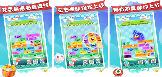 在充满鸟语花香的游戏世界,只不过从玩法上来看和俄罗斯方块极为相似,从上方不断掉落出不同的方块类型,而玩家要通过水平滑动的方式,将方块填满整行即可消除获得相应的分数。还为更多玩家提供了辅助的道具,比如闪电或者是黄金锤等等,核心就是为了让更多的玩家顺利完成闯关,获得更高分数。