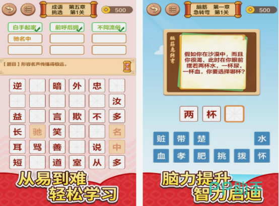 无论是想要学习成语或者是玩接龙类型的手游,这都是寓教于乐,甚至能帮助大家学习的,因为一共收集了多达3万多条,如果能全部学会的话,自然可让自己在这方面的知识得到丰富。整个关卡的挑战当中,也是由易到难的,在精美绚丽的画面中,需要根据规则,完成相应文字的填写以后,让个人获得相应的成就,也能不断的积累知识。