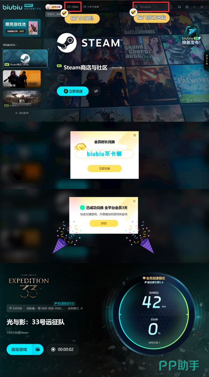 为进一步提升使用体验,输入专属口令【biubiu不卡顿】还可额外获得72小时免费加速时长。无论是在单人剧情推进还是多人协作模式下,biubiu加速器均能有效优化路由路径,保障连接持续稳定,让玩家专注于沉浸式的游戏进程。