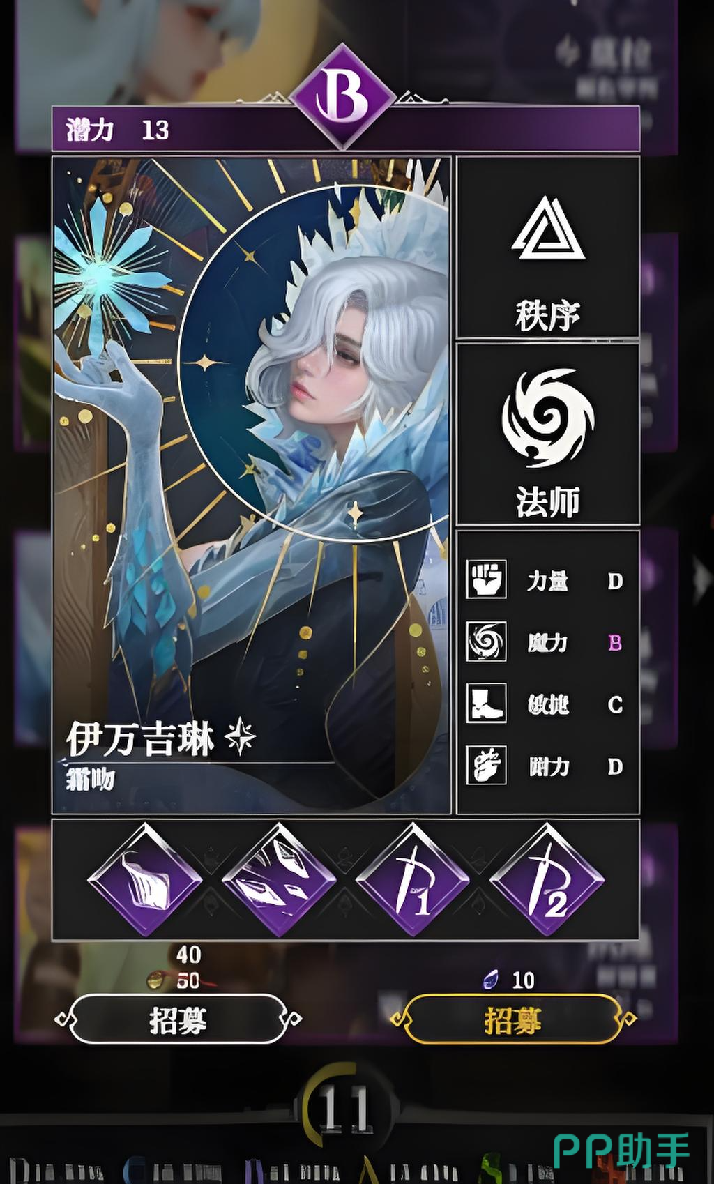 伊万吉琳在游戏中的定位是法师,属于秩序系角色,霜吻的战斗技能分别是普攻技能冰晶飞刃,被动技能严寒、休眠以及能量技能霜冻尖峰。