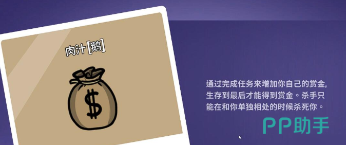 肉汁的核心机制在于通过执行任务逐步累积赏金,完成的任务数量越多,最终结算时可获得的银币奖励也就越可观。但需要注意的是,这一奖励仅在角色存活至游戏结束时才能领取。此外,肉汁具备一项关键防御能力:杀手必须在与其单独相处的情况下才能成功击杀,这意味着在组队行动时,肉汁几乎处于免疫暗杀的状态。