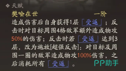 许褚的天赋“樊哙在世”是其核心输出来源。每当他对敌方造成伤害后,便会叠加1层“受反”状态。当拥有3层“受反”时,下一次反击将升级为强化版本,对目标及其周围一圈单位造成高达100%的物理伤害。若未满三层,则每次反击仍可对周围4格内的敌人附加50%物攻的额外伤害,具备稳定的群伤能力。