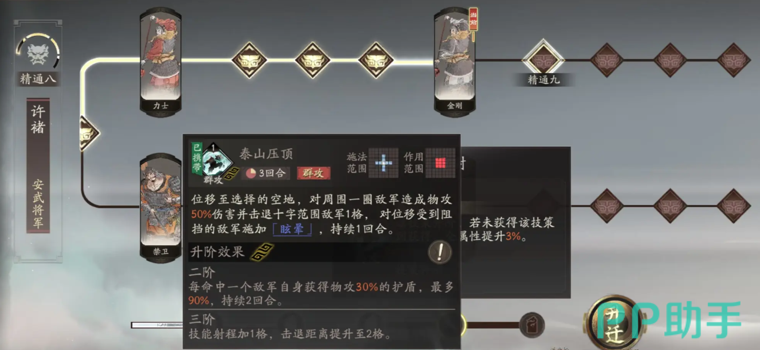 “泰山压顶”允许许褚传送到指定空地,落地时对周边敌人造成50%物攻伤害并击退一格。若目标因障碍无法被击退,则额外施加1回合眩晕控制。此技能在小规模战斗或多敌聚集场景中具有极强控场作用,同样推荐升至二阶以获得护盾加成,避免因先手进场而被集火秒杀。