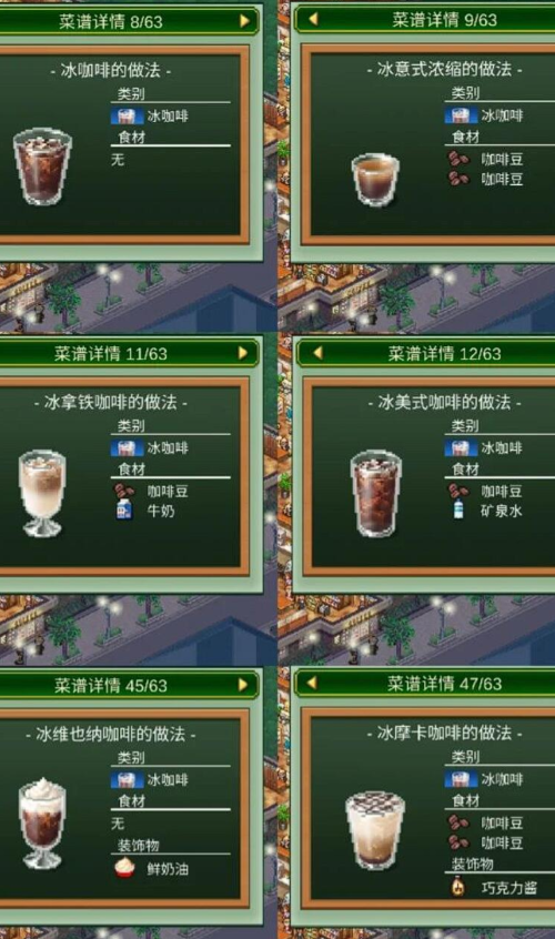 由于在一开始菜品只有最普通的冰咖啡,因此玩家们在拿到足够的钱之后,还需要研究一些新的咖啡种类。这些咖啡在制作的时候所需要用到的材料都是不同的,因此小伙伴们在每天关店结束经营的时候,也需要考虑好第二天购买一些什么食材。你也可以根据自己的想法来调制饮品,并且把它们写进特色菜单中,说不定能够出现一个爆款,大量的吸引客人哦。