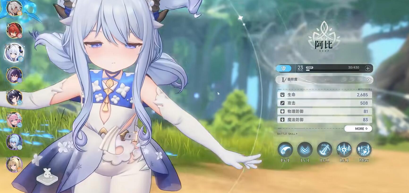 下面是破韧角色:阿比(水龙娘)它的平a打完之后会有一个突进效果,突进之后就能直接进入重击二阶段,这样一套打完能快速削BOSS架势槽。而且大招对3层印记敌人破韧效率提升200%,使用水龙娘配合洛卿结界能实现无缝破防。