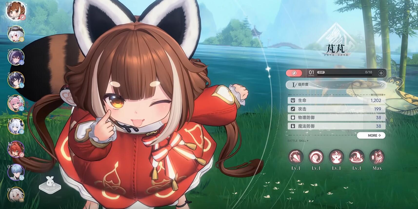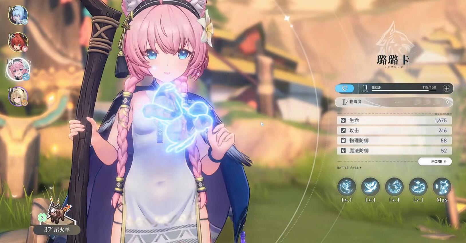 芃芃(火属性狐娘)他的技能与玩法都是主打火属性的,而且技能的最后一段可空中连踢接落地砸击,造成范围火伤。操作上是攻前三段后要去立即蓄力重击,然后再触发空中连击。她的小技能烈焰旋踢能打断敌人施法,但硬直较大要注意释放的时间。