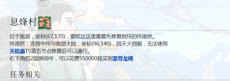 位置就在南边,坐标就是67-170,不过要想来到这边玩家就需要先把怀南桥修好。这一个桥就是一个关键的桥,可以连接中间和南部,但是因为之前被天火毁了,所以根本就没有办法走。玩家就需要找到第5个节点去完成修复,修复完毕之后才可以通过。另外在这个村子的右下角,大家也可以看到有个房间在房间里面就可以购买至尊龙椅,所需要的费用是55万钱。