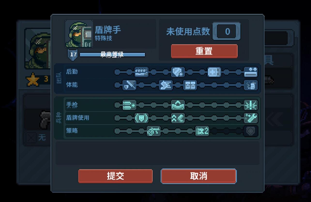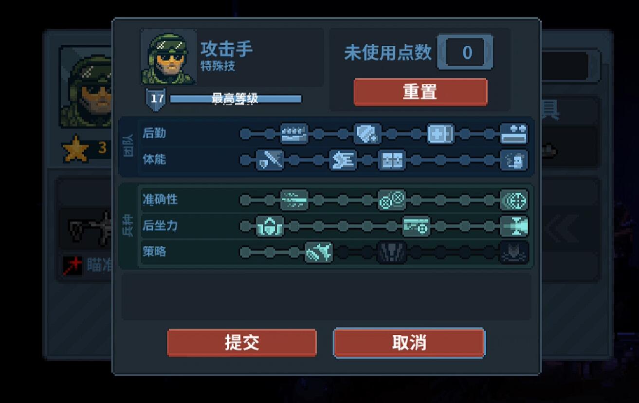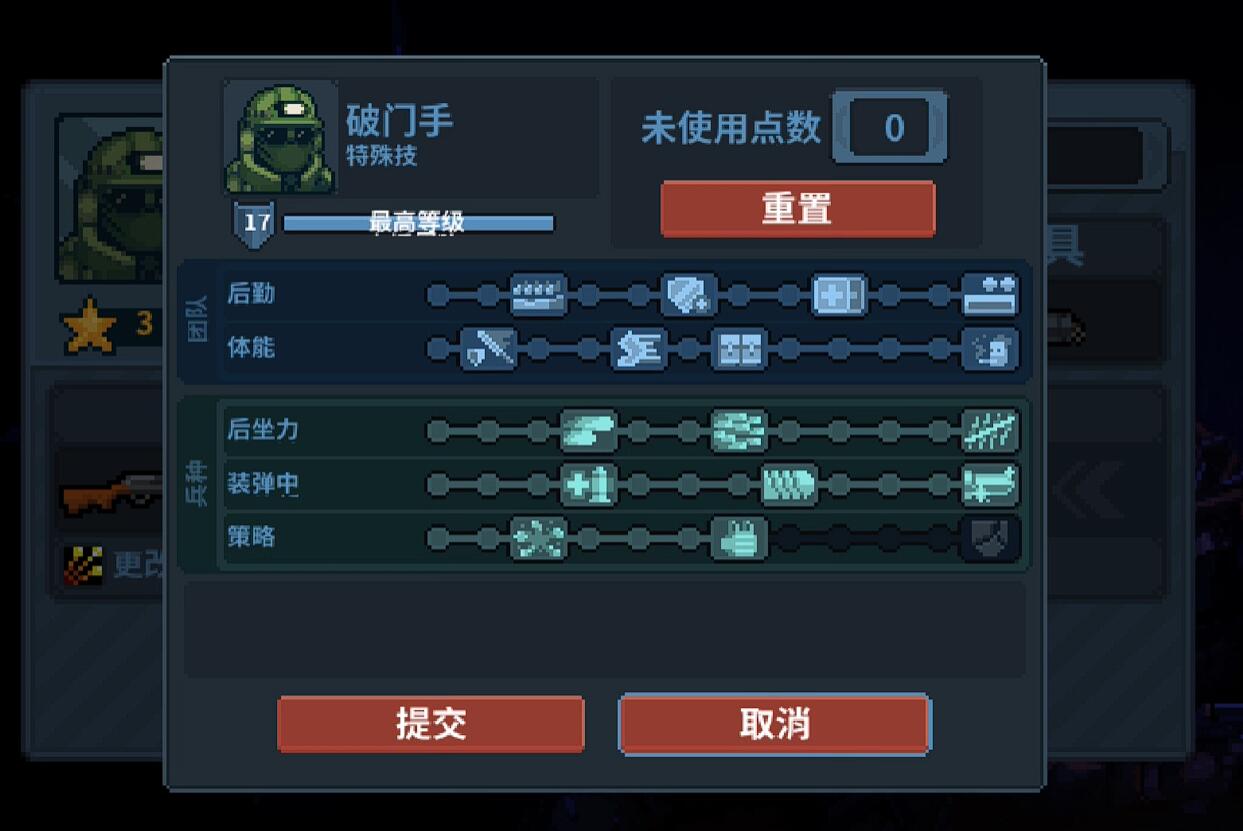 通用技能在细分有分成了后勤和体能,后勤技能必点双倍道具(3点),道具箱容量从2个增至4个,拆弹任务必备。防火服(6点)减少火焰伤害50%,对抗喷火兵很实用。尤其是打喷火BOSS,没有的话特别吃力。体能技能优先点出速度就是生命,移动速度+20%,顽强不屈(12点)降低濒死伤害30%,这个是毫无争议的高难度关卡必备,大家刚开始玩可以先不点,前面难度很低用不上。
