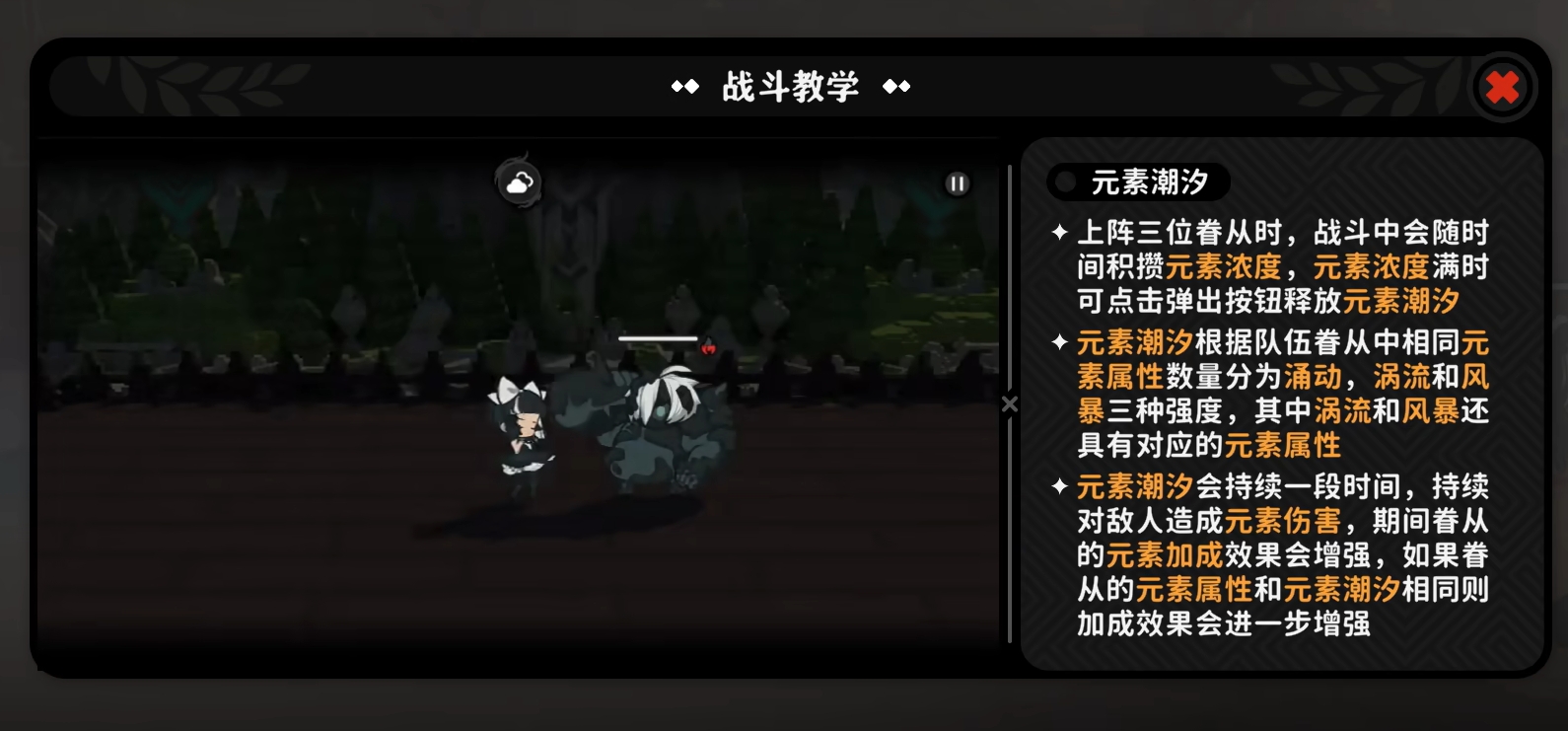此外,火环还加入了一个名为元素潮汐的机制,该机制会在战斗中不断累积能量,且会在能量满后跳出操作按钮,玩家释放后便能根据场上角色的属性数量,来获得不同类型的元素潮汐效果。它共有三个不同的等级,当上阵角色的元素都不同时,为无元素的涌动效果,同一元素角色达到2/3名时,为涡流/风暴效果。同时,元素潮汐在持续时间内,还会持续对周边的敌人造成伤害。此外,元素潮汐发动时只能激活一个效果,不能叠加,既上场的同元素属性角色同时满足涡流和风暴效果,只会激活风暴,不会激活涡流。