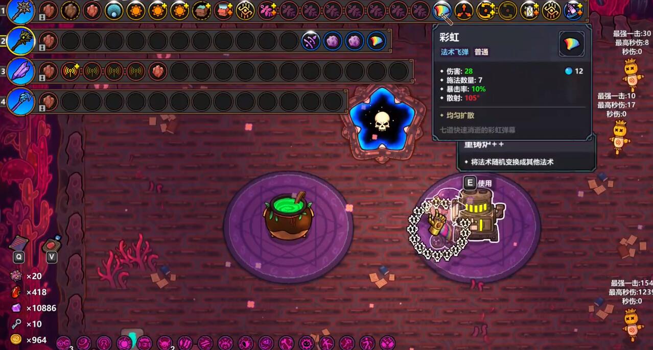 彩虹法术比较绚丽,在施展的时候是七道色彩斑斓的弹道齐发,就跟烟火差不多,但是它的基础伤害却特别的强,通常一发7点之后都全中,这样的话伤害直接会拉满,单次就能够打出28点的高输出,这种输出属于近距离作战的输出方式,能够让玩家感受到刺激,也能够让玩家难以忽略他的实力,其实彩虹要是跟技能搭配在一起,可以产生多重溅射,这样的话就可以有效的扩大了攻击范围,面对大部分敌人的时候,一旦玩家施展了彩虹的法术,就能够瞬间清理一大片小怪物。