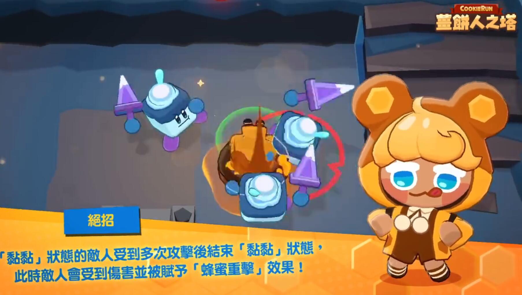 蜜熊饼干的技能最关键的就是黏黏标记与蜂蜜重击的combo,主动技能蜂蜜冲击波释放3道冲击波,可对目标施加黏黏标记,蜂蜜风暴还有引爆标记造成AOE伤害,还能附加蜂蜜重击效果,其中最关键的就是黏黏标记通过每次攻击叠加1层,当叠加至3层时会触发额外伤害,蜂蜜重击可带来大概两成左右的伤害加成,所以说要是标记没叠满就放大招,伤害会丢很多的。