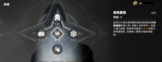 蜘蛛人的定位就是一个操控者,主要就是靠蜘蛛重砸去打出效果。这一个天赋其实就会比较吃配合,只要是我方的角色使用战斗技能或者是终极智能打破被缠绕的敌人。那蜘蛛人就会直接追着其中一个目标,然后迅速的补上一刀。伤害就是自身攻击力的180%,而且还可以赚30点的终极能量。这就说明蜘蛛人并不可能会单打独斗,还是需要和队友去配合,才能有效去发挥实力,所以在玩这个角色时就应该手动去操作,自动模式根本就无法精准去触发。