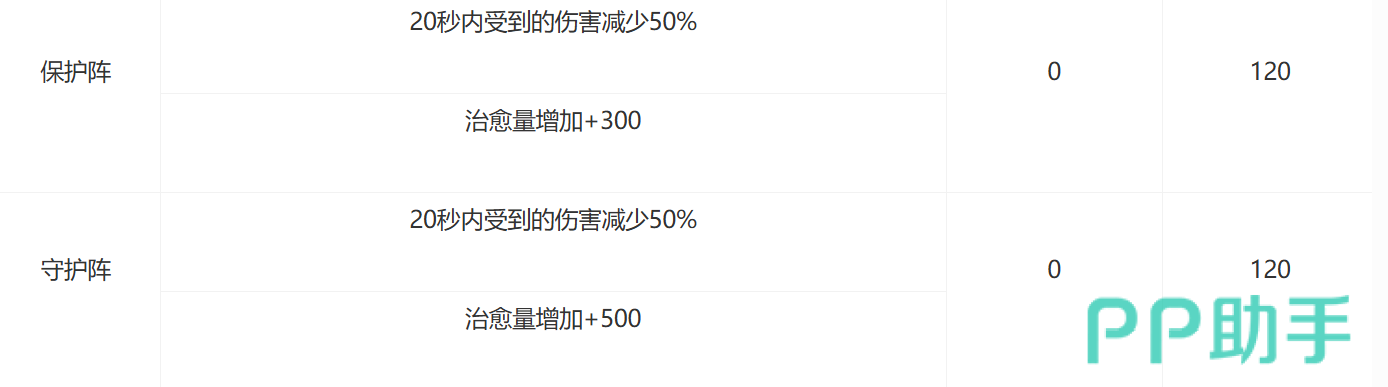 阵法类技能是护法星的特色技能,在使用了保护阵以后可以在20秒的时间内减少自身50%的伤害,同时还能增加300点的治愈量,守护阵作为保护阵的升级版本,治愈量更是直接从300点升级到 500点。