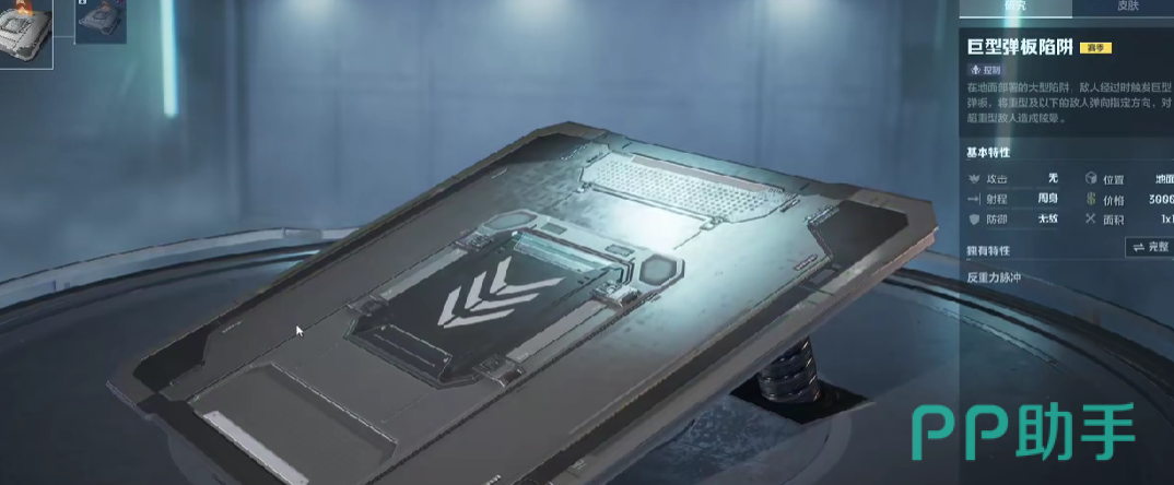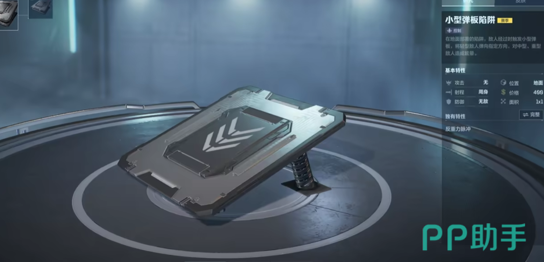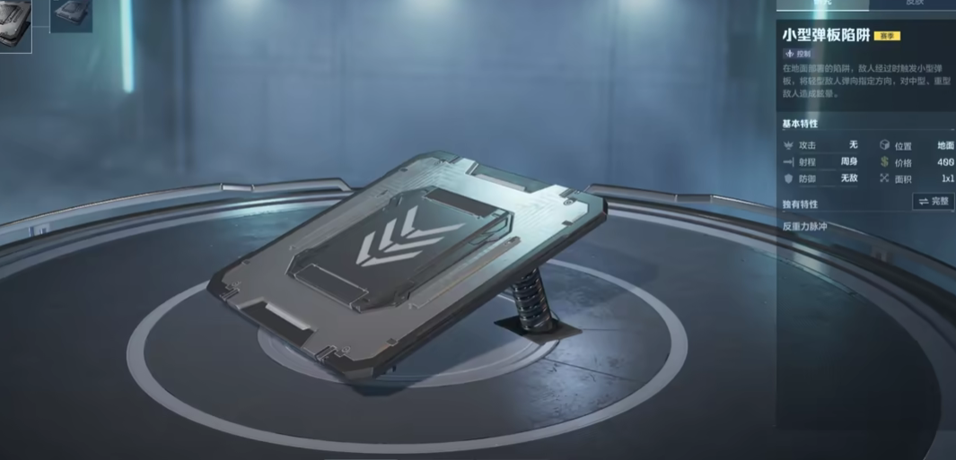 巨型弹板陷阱是一种控制类型的陷阱,在地面上布置上巨型弹板陷阱以后,一旦有敌人从陷阱上经过,陷阱上的巨型弹板就会被触发,可以直接将重型及以下敌人都给弹到指定的方向,对于超重型的对人还能造成眩晕的效果,巨型弹板陷阱还有个独特的特性-反重力脉冲,充能以后可以直接发动反重力脉冲,将自身周围的所有的怪物都给弹射计费,怪物被击飞的距离和怪物的身形相关,体型越小的怪物被击飞的越远,若是已经超过了一定提醒的话,则没办法击飞。