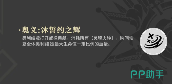 在输出效果上面也是需要靠子弹的精准来对敌人进行输出,最后奥利维娅是有个大招,她的大招是需要根据这个戒律典籍来进行输出的,使用大招的时候,她会打开手中的这本戒律典籍,然后消耗她之前积累的所有灵魂火种,灵魂火种在游戏中就相当于这个角色的能量积累数值,在消耗之后带来的能力是恢复全体角色的血量,并且在恢复数值上是根据奥利维娅的生命值来进行比例提升的,所以如果大家想要用好奥利维娅的话,把她放在辅助位上是比较不错的,她的很多技能基本都是给自己带来能量加成的,还有给队友带来回血效果,而且特别是大招,可以给全体的队友都带来一定血量的恢复。