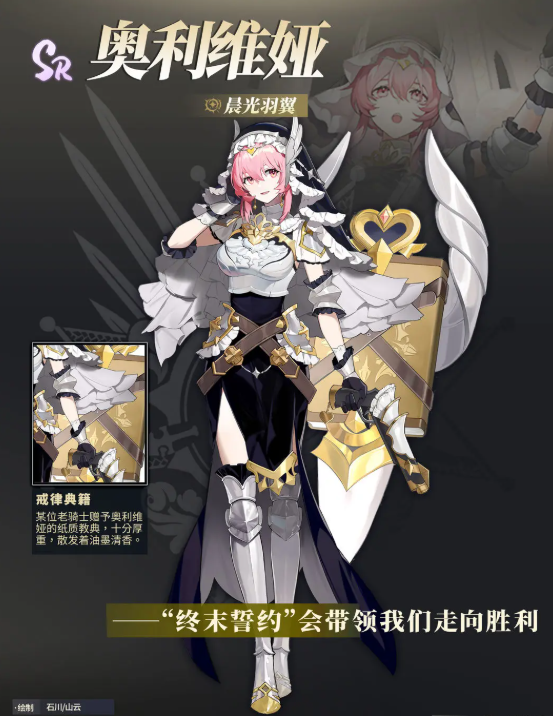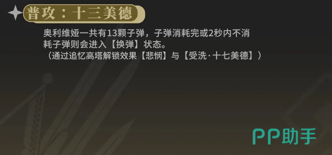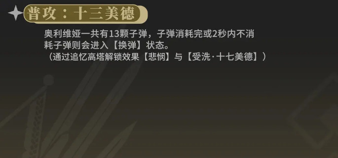 奥利维娅这个角色本身在剧情里面其实是一个骑士,而且在外观上面看起来也是比较带有骑士外观风格的,她手中一般都会拿着一本戒律典籍,这本典籍是一位老骑士赠送给他的,通过这一点,大家可以在很多剧情里面辨认出来这个角色,奥利维娅在普攻上面有很多的射击伤害效果,他的普攻叫做十三美德,使用这个技能的时候,奥利维娅会连续发射出来13颗子弹,这13颗子弹就是她发挥普攻能力的主要核心效果。
