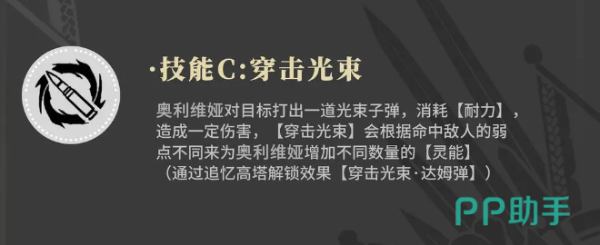 奥利维娅的第三个技能叫做穿击光束,使用的时候释放出来的特效就是一团光束,这个光束是一个炮弹类型的子弹效果,进行输出的时候也是需要消耗耐力数值的,此时最基础的效果是造成一定的伤害,但是如果在触发了穿击光束的话,那么则会根据此时命中敌人的弱点效果,来为奥利维娅再次增加灵能恢复的能力,这个效果的话后期还在可以解锁之后达成达姆弹的输出能力,所以奥利维娅的3个技能基本上都是可以给自己增加一定灵能积累的。