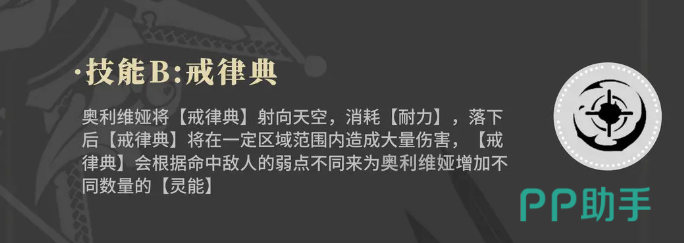 消耗灵能数值打出来的子弹都是叫做灵弹的,这个灵弹还会治愈奥利维娅目前的一些血量,不过是按照她的最大生命值来划分出来的一定血量,这个技能想要使用的话,后期也是需要进行结速才可以使用的,她的第2个技能叫做戒律典,这个技能在使用的时候是会向天空打出技能特效的,且在上面使用这个技能还需要消耗一定的耐力,从空中降落的接力点会在落下的范围之内带来区域伤害,且在伤害数值上面,会比第一个技能上面的灵弹数值更多一些,而且会根据此时命中的敌人他们身上的弱点,来为奥利维娅再增加不同的灵能数量,积累效果。