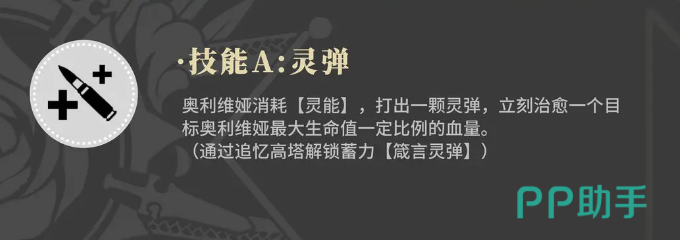 使用普攻在子弹消耗完之后,两秒之内不消耗其他子弹的话,就需要进入一个换弹的状态,因为首次输出的子弹数目有限,所以想要再一次进行输出的话,中间就是有两秒的停顿时间,如果想要将这个两秒的停顿效果简短一些的话,大家后期可以参与高塔的挑战,在其中就可以解锁悲鸣的这个效果,这样就可以加速奥利维娅的攻击啦,其次在她的技能里面还有一个灵弹效果,这是奥利维娅的第一个技能,使用这个灵弹的时候,会消耗一定的灵能数值。