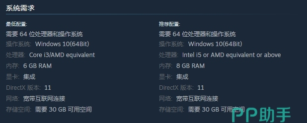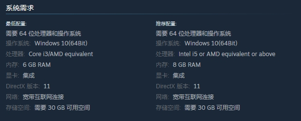 本游戏的系统需求配置较为简单,由官方数据页面可知,最低和推荐配置较多相似,都需要64位Windows 10系统、Directx11的版本、以及配备集成显卡,想要下载体验游戏,需要预留最低30GB的可用存储空间。不同之处在于,设备处理器最低需要N卡i3代的性能,推荐在i5代及以上,A卡与N卡性能相似的可替换,最低电脑内存需要6GB,而推荐则最好在8GB及以上。