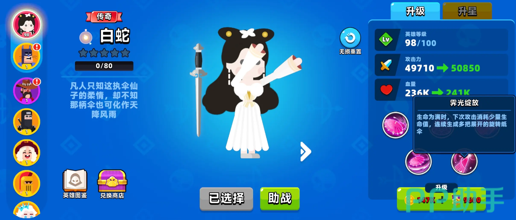 最后介绍的是活动限定角色白蛇,她拥有五个可使用技能,其中最具代表性的是“花伞轻扬”,具备极强的整体输出能力。另一核心技能“旋伞飞花”可在释放时展开伞具,依据旋转方向向四周发射带有属性加成的光波,造成连续范围伤害。此外,技能释放后还能触发额外射击效果,进一步扩大清怪效率。凭借出色的AOE能力,白蛇在面对群怪密集的关卡时表现出色,是清理小兵和应对波次进攻的理想人选。
