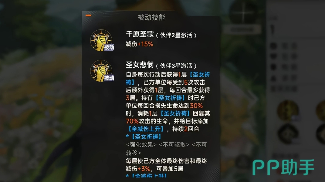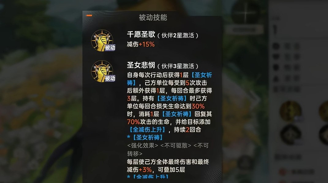从技能机制上来说,伊丽莎白的能力在于圣女祈祷这个效果。该效果上限为五层,只能由伊丽莎白自己持有,且每一层均能为全体友军角色提供增伤与减伤,层数越高,圣女祈祷带来的增益效果也就越出色。若友军角色在单位回合内损失的生命到达了一定的比例,且伊丽莎白有三星时,还能通过消耗一层圣女祈祷来为目标恢复血量,并让目标友军角色获得全减伤上升的特殊增益,该增益可令目标所有伤害减免能力都得到大幅提升,保人能力相当的夸张。