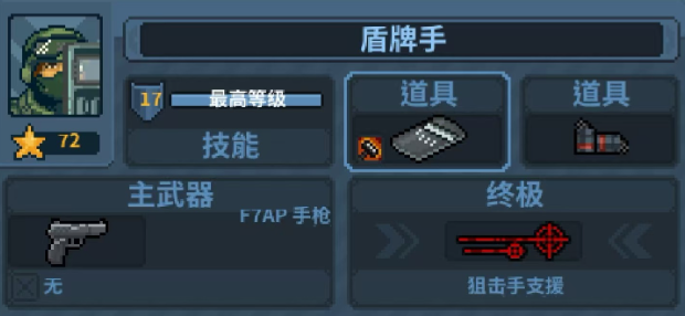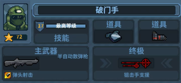 角色的选择,这是开局的关键游戏里面的角色不少,但是真心推荐给大家的也就两个,一个就是盾牌手,一个是破门手。其他的那些角色其实操作难度比较高,前期真的没有必要浪费时间,强度也不会有太多的差距。对于新手来说,破门手就是绝对性的选择,那一把武器所造成的伤害是比较高的,基本上一枪就可以把木门轰开。近距离在打小怪时也是基本上一枪一个,不过需要注意的是这把枪的射程比较短,很容易会误伤队友。