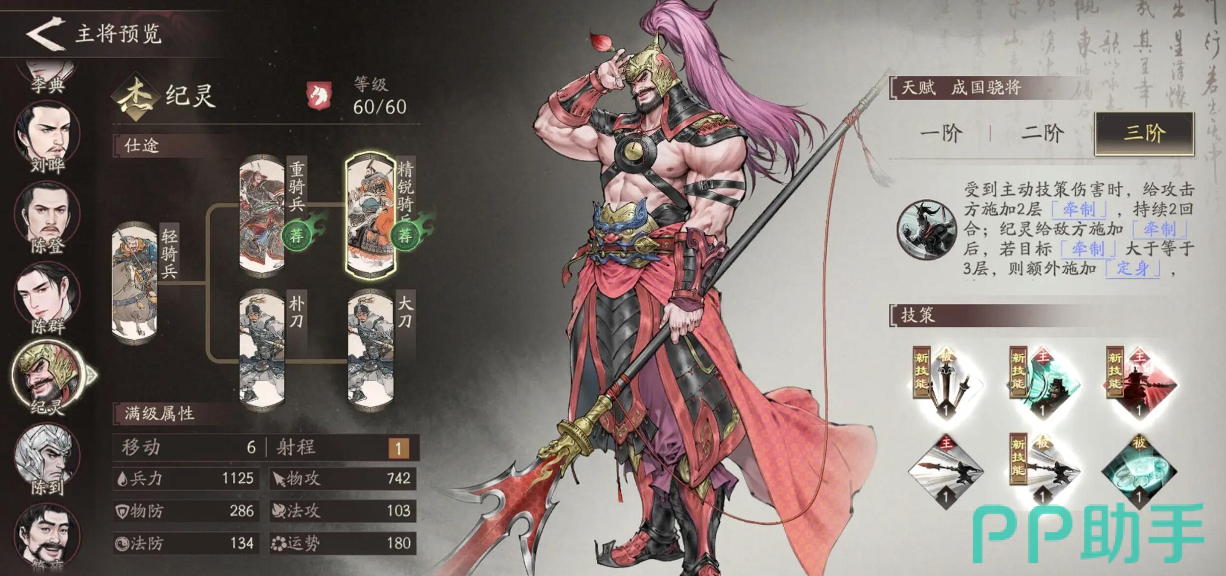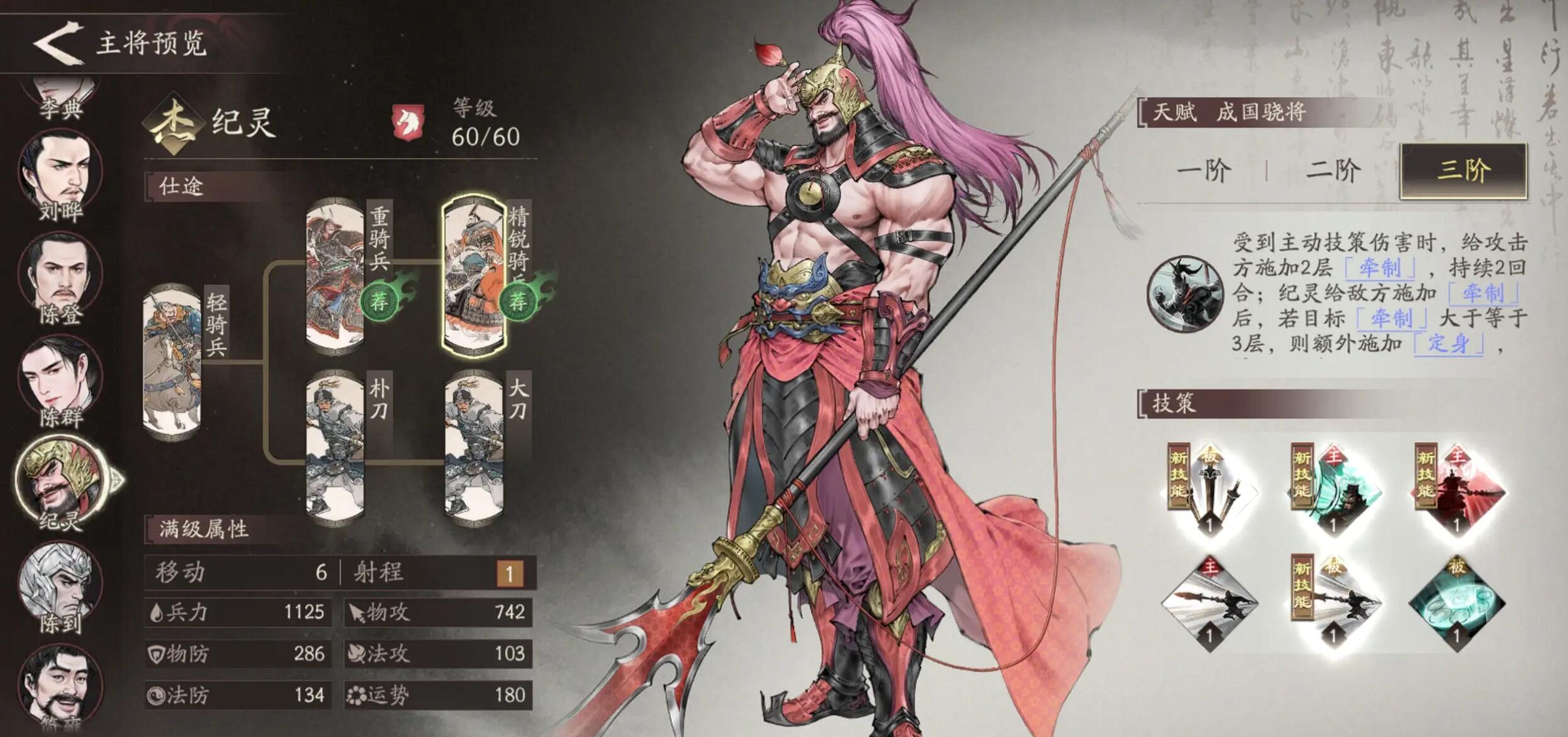 培养纪灵注意属性全加统率,速度到100就能先手嘲讽,四星武将至少3红,不然统率差太多,白板抗伤能力降不少,克制弓兵和步兵,但千万别碰藤甲盾和火攻队,简直是白给。总的来说,他不算版本T0,但三阶后绝对是平民骑兵控制流的性价比之选,没有其他武将培养纪灵也是能过渡一下的,大家快去试试吧。